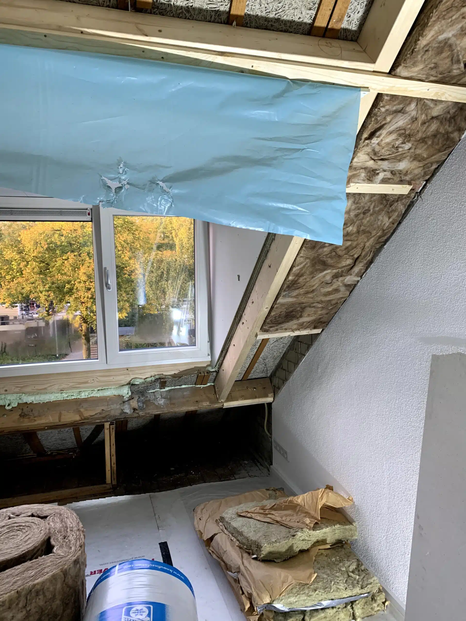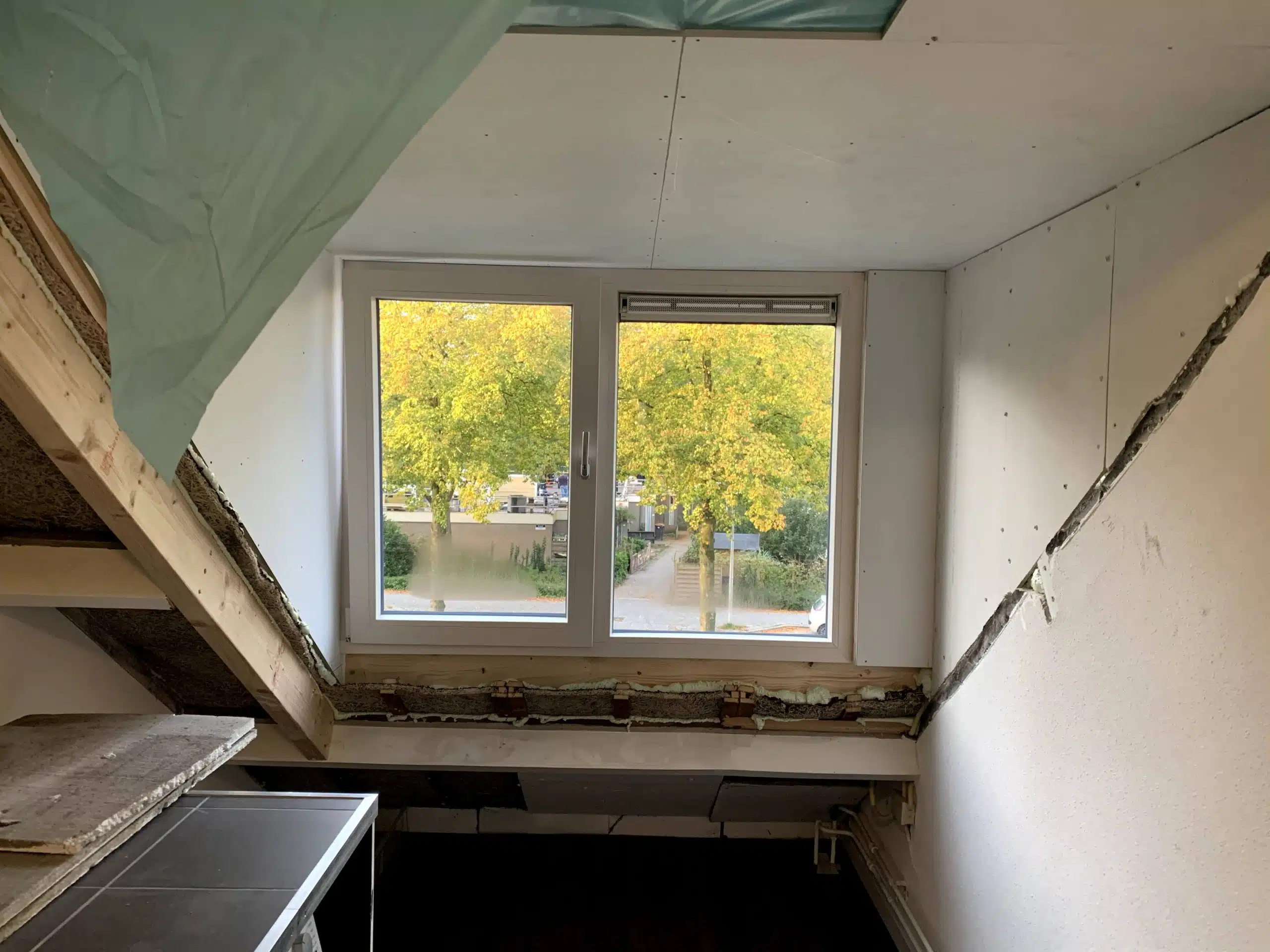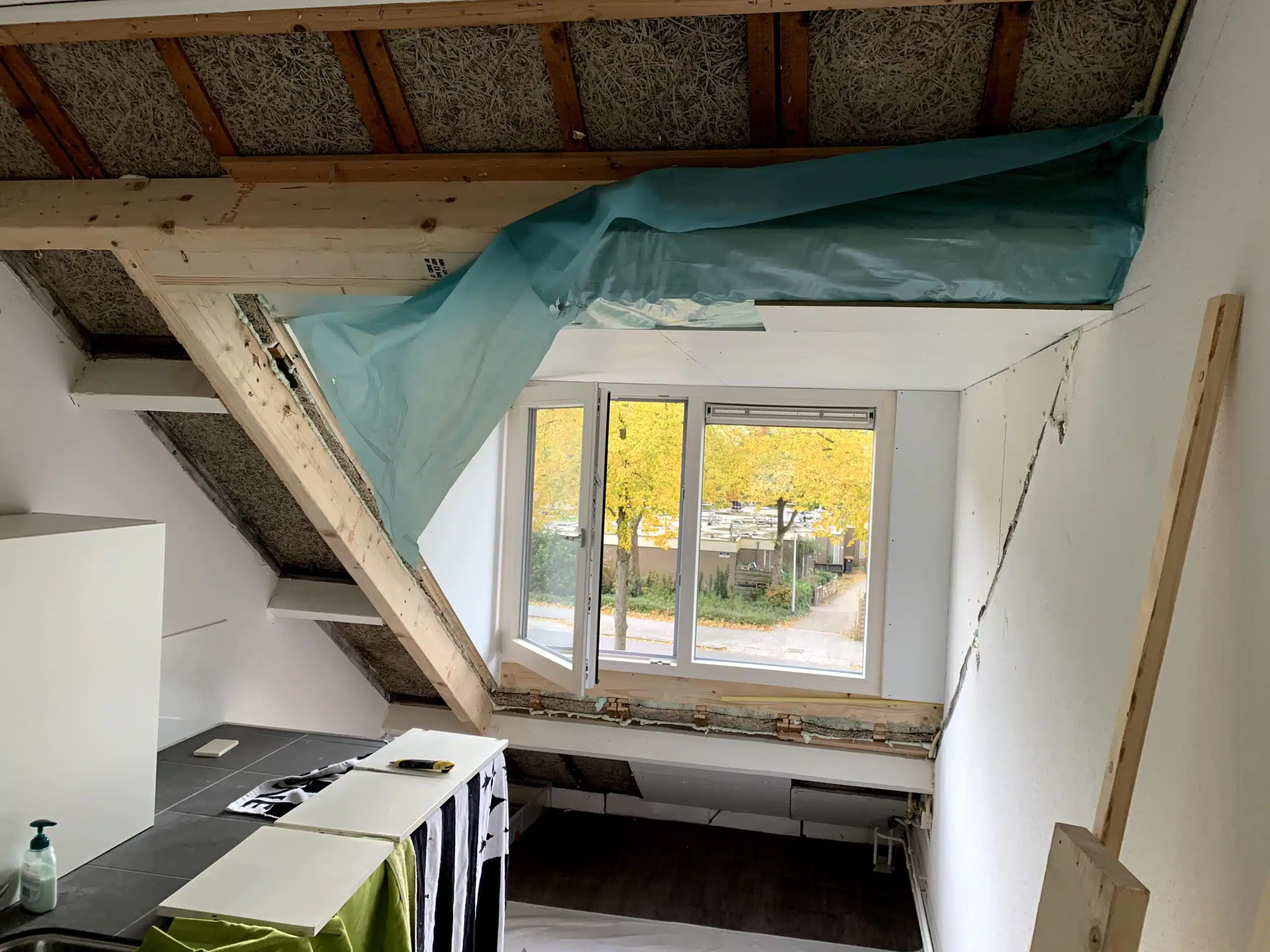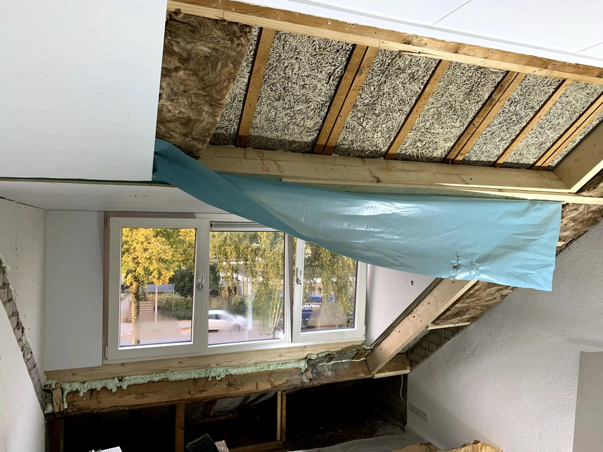Aftimmeren van een nieuw geplaatste dakkapel inclusief isoleren van het dak en het plaatsen van knieschotten.