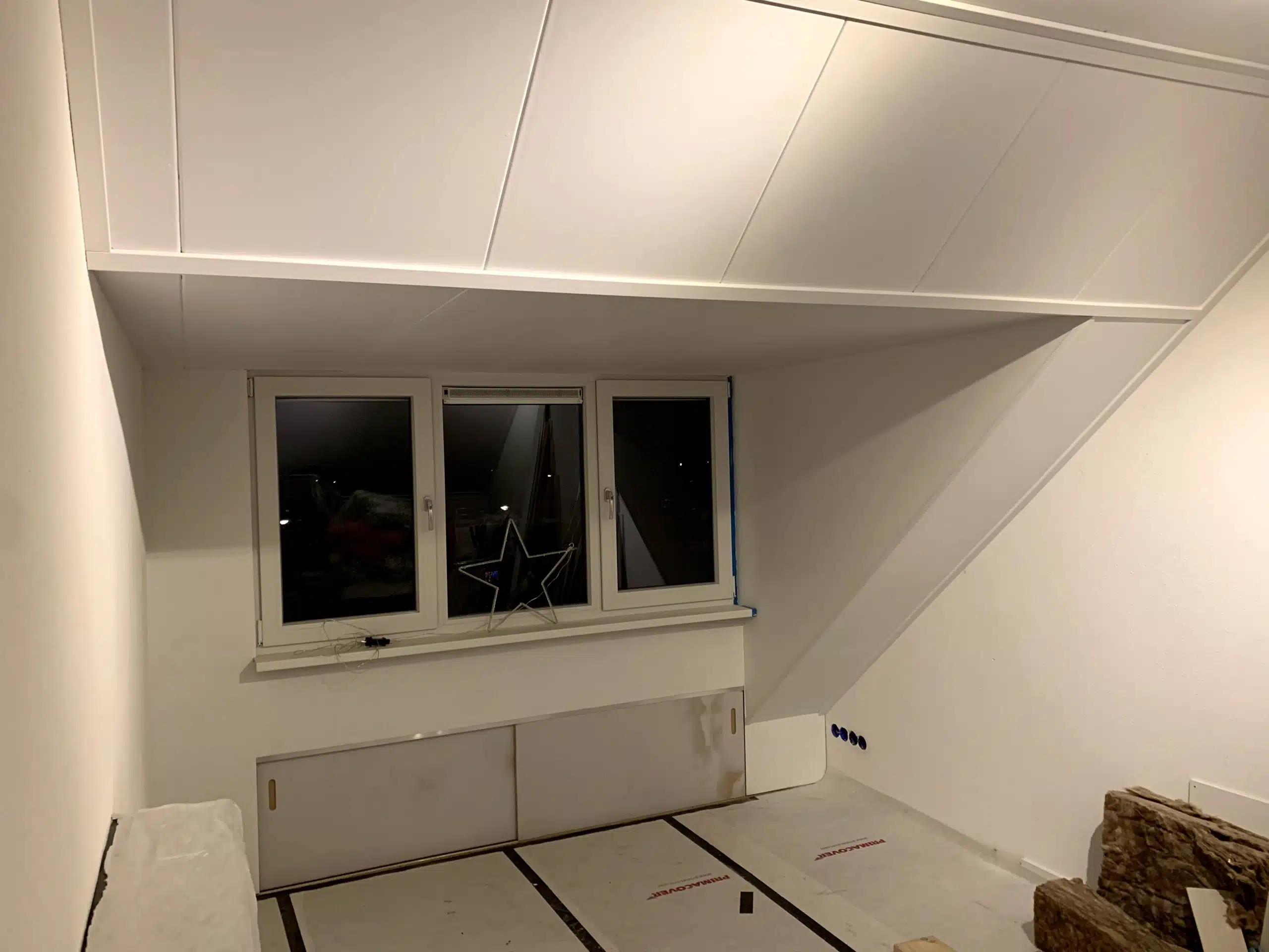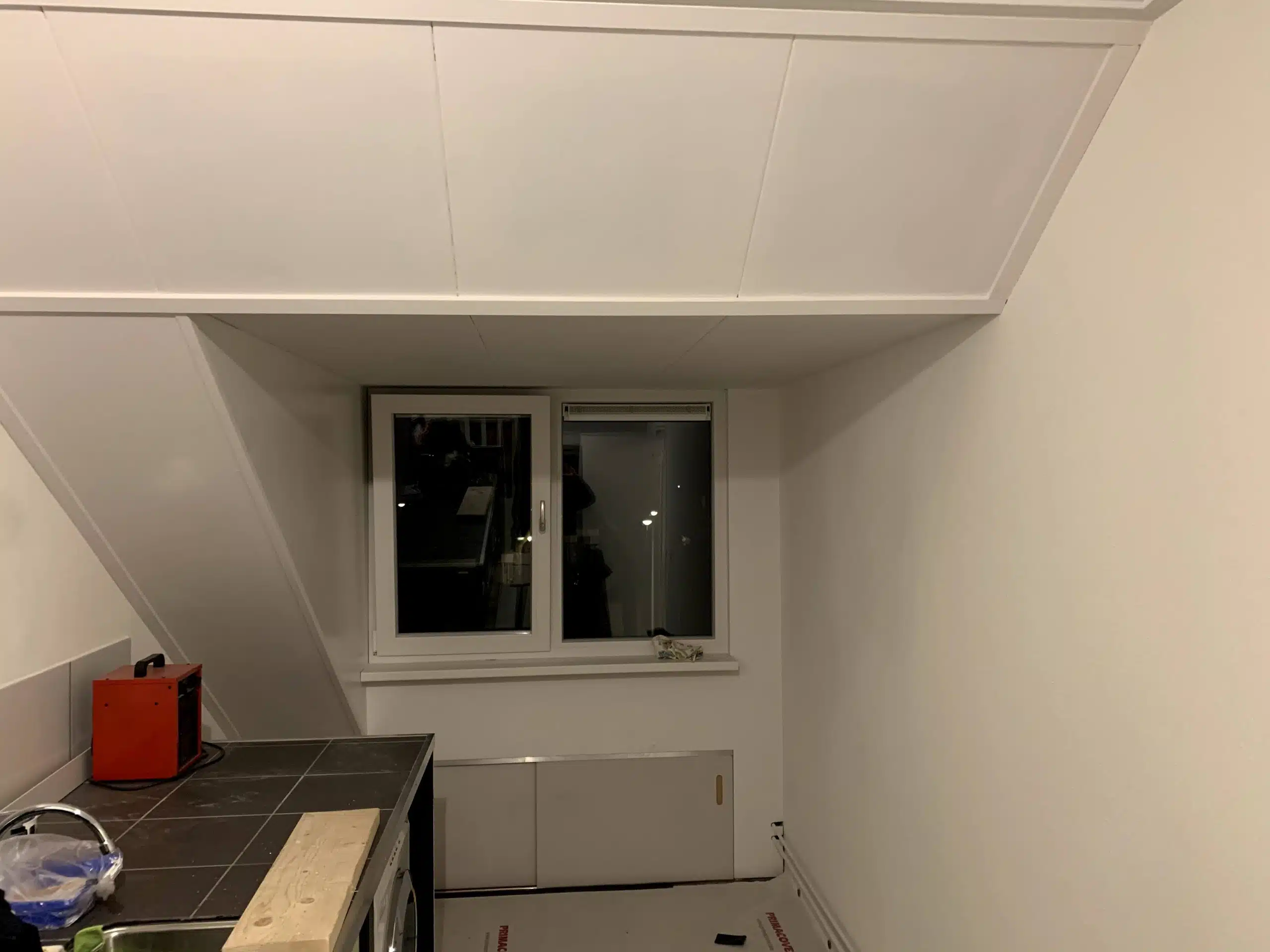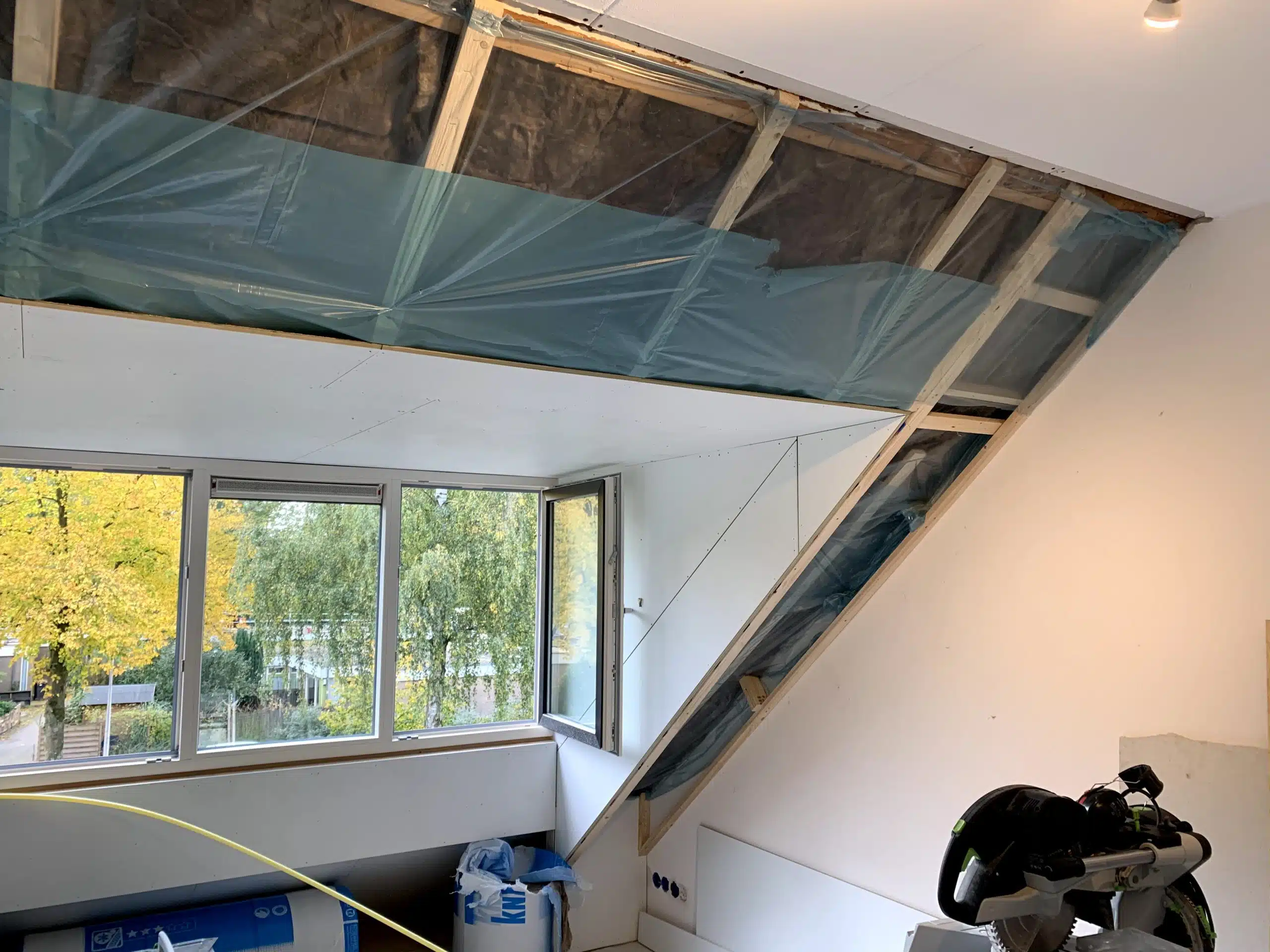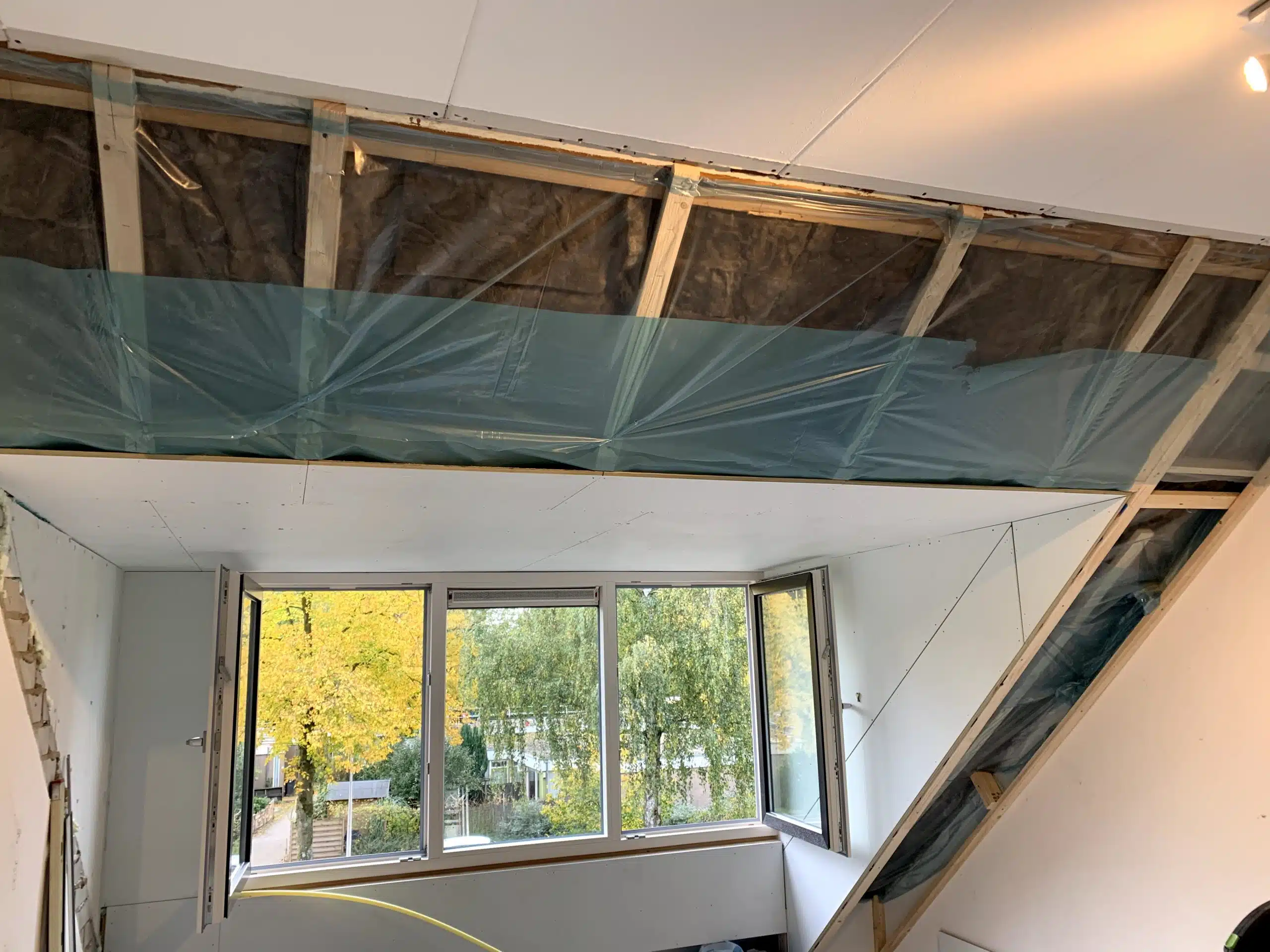 Aftimmeren van een nieuw geplaatste dakkapel inclusief isoleren van het dak en het plaatsen van knieschotten.