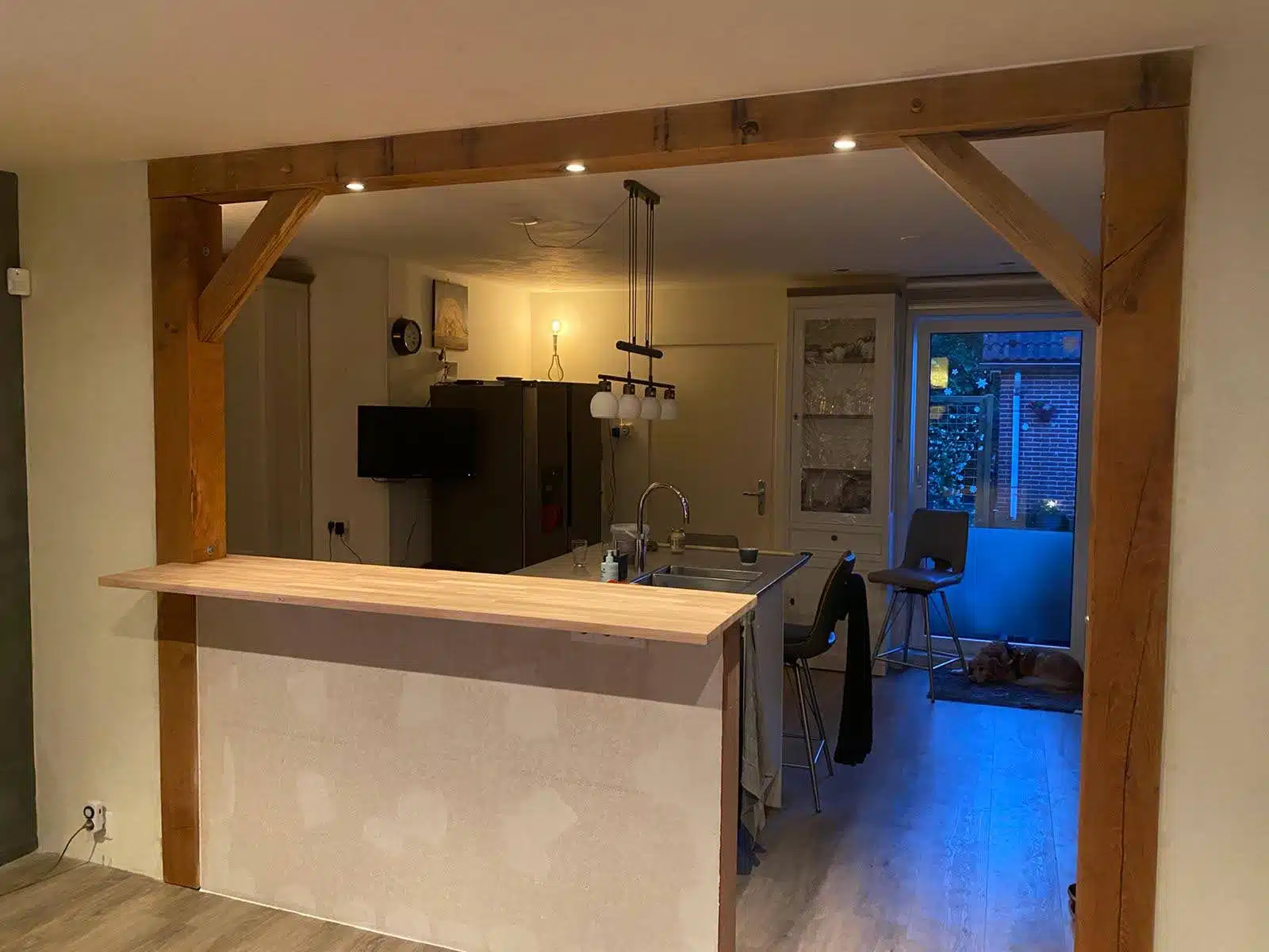 Na uitvoerig overleg met de klant is gekozen voor deze erg mooie oplossing. Door het plaatsen van een eiken gebint met volledig geïntegreerde ledverlichting in combinatie met en mooi eiken barretje is de ruimte optisch veel ruimer geworden en bereikt het daglicht de gehele woonkamer.