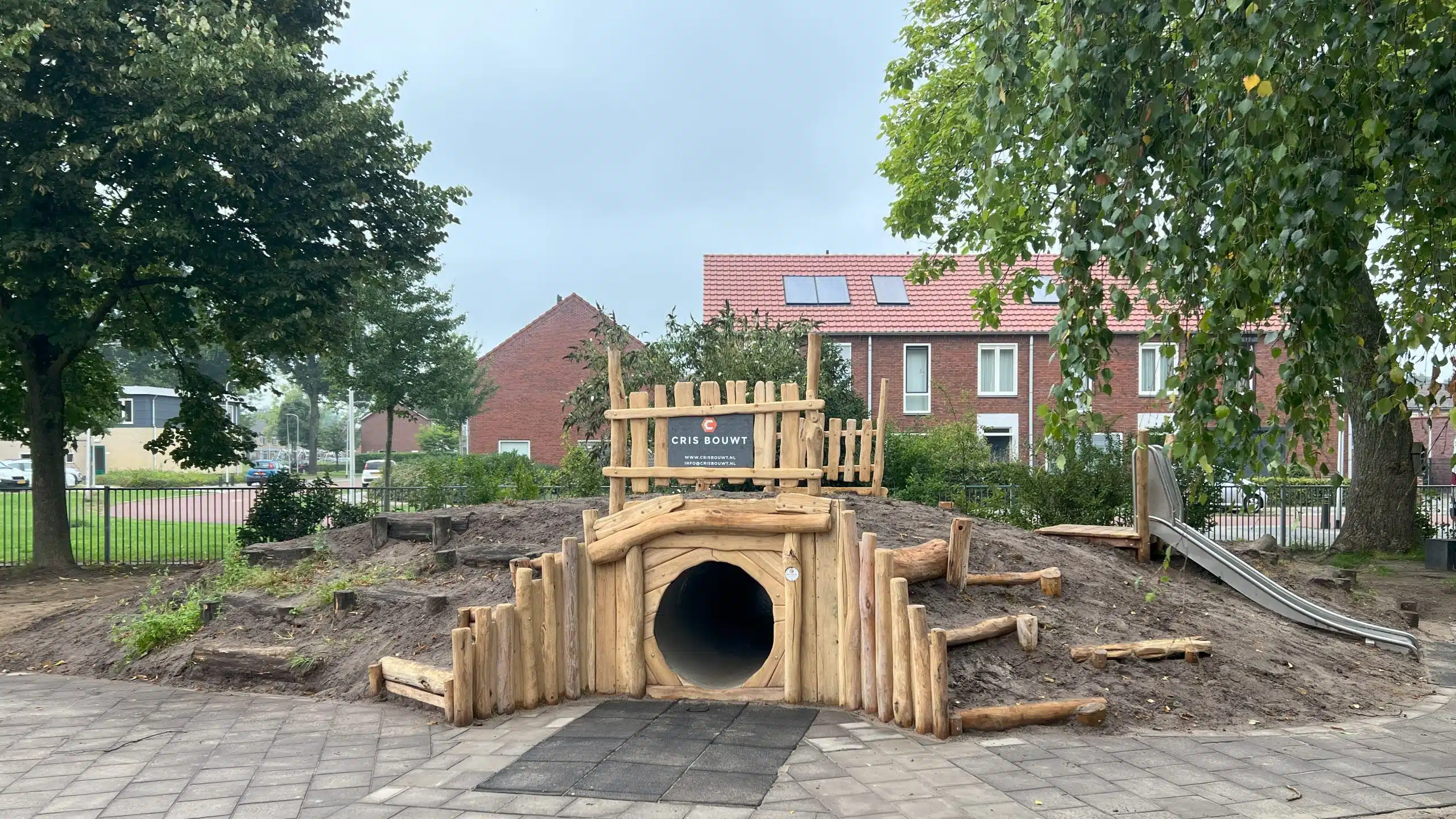 De kale betonnen tunnelingangen zijn bekleed met een Robinia hout met de uitstraling van een oude goudmijn. Om de ingangen nog imposanter te maken is er boven de ingang een hekwerk gemaakt, welke tevens voorkomt dat kinderen onbedoeld van de bult vallen.